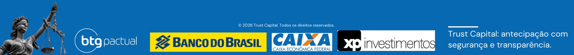 O BTG Pactual é o maior banco de investimentos da América Latina e atua como fundo financeiro parceiro da Trust Capital. Por meio dessa parceria, oferecemos acesso a soluções financeiras completas, incluindo investimentos, crédito e antecipação de precatórios e RPVs, com assessoria especializada para pessoas físicas e empresas, unindo solidez, segurança e atendimento personalizado.